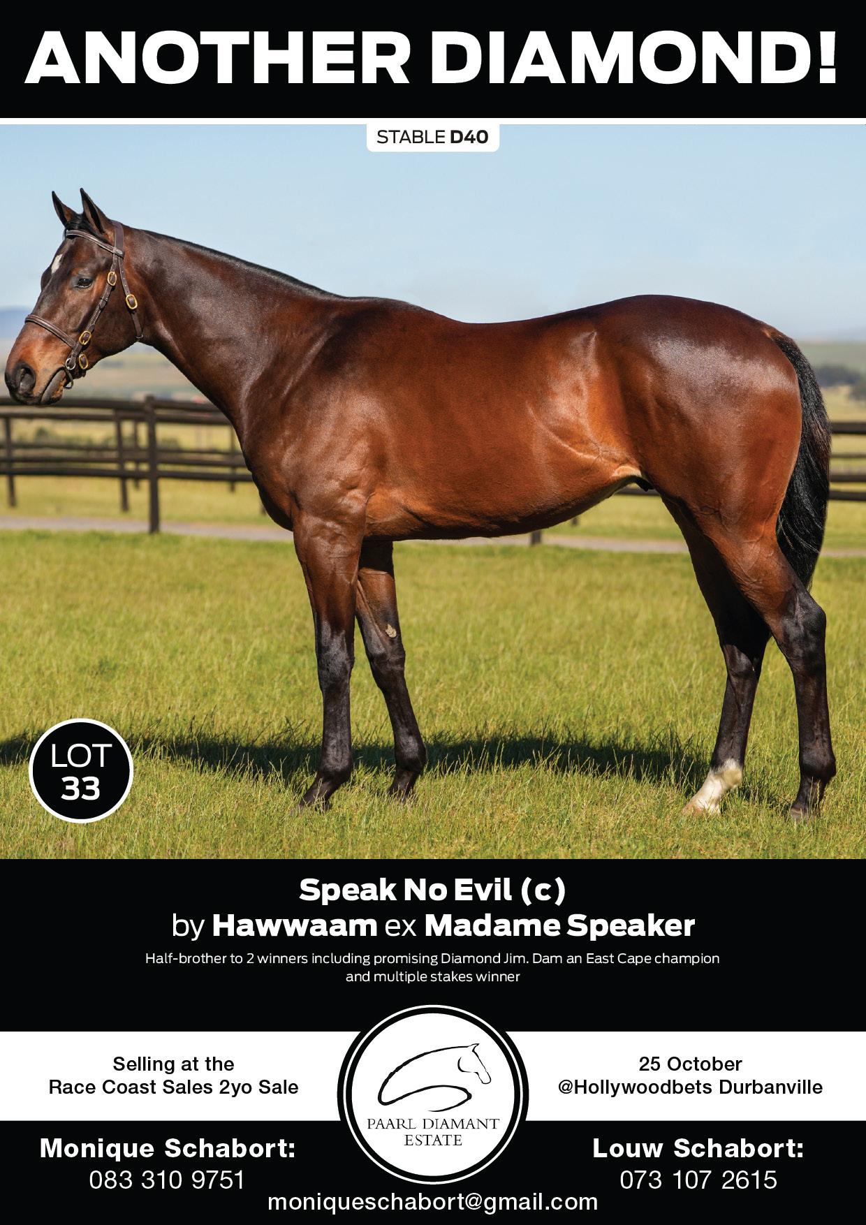 Paarl Diamant’s Monique Schabort will be bringing a very smart draft to this year’s Two-Year-Old Sale, with this consignment including two-year-olds sired by the likes of Erik The Red, Gimmethegreenlight, Master Of My Fate, One World and Rafeef.