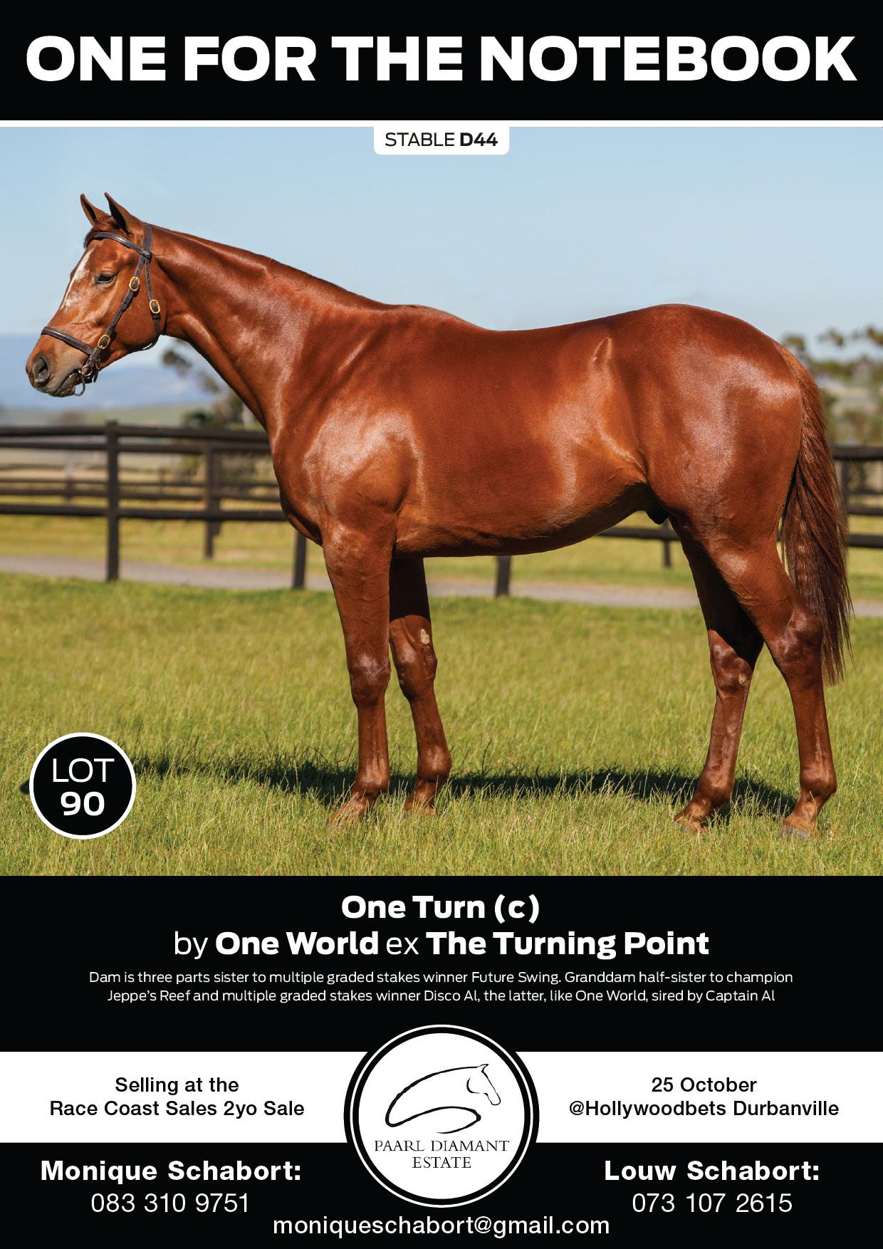 By one of South Africa’s most promising stallions, out of a four-time winning daughter of Goldfields Sprint Listed winner Lady Perez. He is an athletic son of One World that shows a good turn of foot. This scopey colt has a good rein and shows great action.