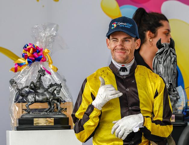 Sporting a new-look hairstyle in Suzette Viljoen’s Royal Aussie silks, a pensive looking Grant van Niekerk grabbed a nice feature double at Hollywoodbets Kenilworth on Saturday and is currently at 7th on the national log with 53 winners at a strike rate of 18,5%. He is third overall on stakes earnings, with a gross R12 632 000. Chase Liebenberg took the photograph.