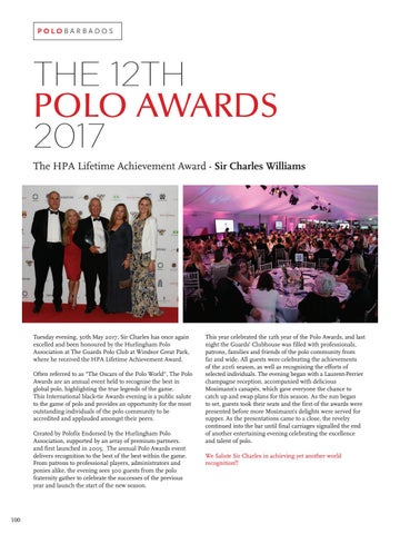 Tuesday evening, 30th May 2017, Sir Charles has once again excelled and been honoured by the Hurlingham Polo Association at The Guards Polo Club at Windsor Great Park, where he received the HPA Lifetime Achievement Award. Often referred to as "The Oscars of the Polo World", The Polo Awards are an annual event held to recognise the best in global polo, highlighting the true legends of the game. This International black-tie Awards evening is a public salute to the game of polo and provides an opportunity for the most outstanding individuals of the polo community to be accredited and applauded amongst their peers. Created by Polofix Endorsed by the Hurlingham Polo Association, supported by an array of premium partners. and first launched in 2005, The annual Polo Awards event delivers recognition to the best of the best within the game. From patrons to professional players, administrators and ponies alike, the evening sees 300 guests from the polo fraternity gather to celebrate the successes of the previous year and launch the start of the new season.