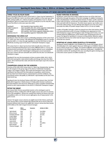 Sporting KC Game Notes | May 1, 2016 vs. LA Galaxy | SportingKC.com/Game-Notes SPORTING KANSAS CITY NEWS AND NOTES (CONTINUED) NUNO THRIVING IN DEFENSE