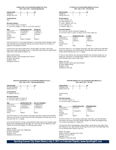 Scoring Summary: KC--Sapong 2 (Zusi 2) 31 Misconduct Summary: SJ: CAUTIONS: Corrales 42, Lenhart 50 KC: CAUTIONS: Collin 52, Sassano 54 Stats Sporting Kansas City San Jose Earthquakes TOTAL SHOTS: 13 (Arnaud/Sapong 3) 15 (Stephenson 4) SHOTS ON GOAL: 4 (4 tied with 1) 4 (Stephenson 2) FOULS: 9 (Arnaud/Collin 2) 10 (3 tied with 2) OFFSIDE: 5 1 CORNER KICKS: 4 4 SAVES: Nielsen 4 Busch 3 SPORTING KANSAS CITY--Jimmy Nielsen, Chance Myers, Seth Sinovic, Aurelien Collin, Matt Besler, Graham Zusi (Kei Kamara 63), Davy Arnaud, Omar Bravo (Teal Bunbury 86), Birahim Diop, Luke Sassano (Julio Cesar 61), C.J. Sapong. SAN JOSE EARTHQUAKES--Jon Busch, Steven Beitashour, Bobby Convey, Jason Hernandez, Bobby Burling, Anthony Ampaipitakwong (Ellis McLoughlin 56+, Scott Sealy 89), Khari Stephenson, Ramiro Corrales, Sam Cronin (Simon Dawkins 57+), Brad Ring, Steven Lenhart. Referee: Paul Ward Referee’s Assistants: Darren Clark, Philippe Briere 4th Official: Tyler Ploeger. Attendance: 18,467. Temperature: 83 and Overcast.