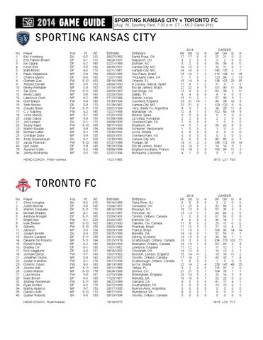 SPORTING KANSAS CITY 2014 CAREER No. Player Pos Ht Wt Birthdate Birthplace GP GS G A GP GS G A 1 Eric Kronberg GK 6-5 210 06/07/1983 Santa Rosa, CA 17 17 0 0 22 21 0 0 2 Erik Palmer-Brown DF 6-1 175 04/24/1997 Napoleon, OH 3 2 0 0 3 2 0 0 3 Ike Opara DF 6-2 180 02/21/1989 Durham, NC 3 2 0 0 56 39 6 0 4 Kevin Ellis DF 5-9 160 06/30/1991 Kansas City, MO 14 10 0 1 16 11 0 1 5 Matt Besler DF 6-0 170 02/11/1987 Kansas City, MO 14 14 0 1 140 135 2 7 6 Paulo Nagamura MF 5-8 154 03/02/1983 Sao Paulo, Brazil 14 14 1 2 215 194 11 18 7 Chance Myers DF 6-0 165 12/07/1987 Thousand Oaks, CA 7 7 0 1 123 98 2 13 8 Graham Zusi FW 5-10 160 08/18/1986 Orlando, FL 15 14 3 4 138 105 20 35 9 Antonio Dovale MF 5-8 152 04/04/1990 A Coruna, Galicia, Spain 11 9 1 2 11 9 1 2 10 Benny Feilhaber MF 5-9 160 01/19/1985 Rio de Janeiro, Brazil 22 22 3 5 101 90 11 18 11 Sal Zizzo FW 5-11 165 04/03/1987 San Diego, CA 13 9 0 3 83 38 2 11 12 Mikey Lopez MF 5-8 160 02/20/1993 Dallas, TX 4 4 0 0 4 4 0 0 13 Lawrence Olum MF 6-2 185 07/10/1984 Nairobi, Kenya 15 11 2 1 57 30 3 2 14 Dom Dwyer FW 5-9 180 07/30/1990 Cuckfield, England 23 21 14 1 40 28 16 3 15 Seth Sinovic DF 5-9 170 01/28/1987 Kansas City, MO 21 21 0 1 123 120 0 6 16 Claudio Bieler FW 5-11 170 03/01/1984 Vera, Santa Fe, Argentina 8 3 1 0 36 28 11 4 17 C.J. Sapong FW 6-2 185 12/27/1988 Manassas, VA 12 4 1 0 102 66 19 9 18 Victor Munoz MF 5-7 165 07/25/1990 Madrid, Spain 0 0 0 0 0 0 0 0 20 Jorge Claros MF 5-9 155 01/08/1986 La Ceiba, Honduras 2 2 0 0 2 2 0 0 21 Jon Kempin GK 6-1 170 04/08/1993 Overland Park, KS 1 0 0 0 1 0 0 0 22 Soony Saad FW 5-10 165 08/17/1992 Dearborn, MI 14 5 1 0 50 22 6 5 23 Martin Steuble MF 5-8 158 06/09/1988 Schlieren, Switzerland 1 0 0 0 1 0 0 0 24 Michael Kafari MF 6-1 175 10/30/1991 Accra, Ghana 0 0 0 0 0 0 0 0 25 Christian Duke MF 5-9 155 06/05/1991 Overland Park, KS 0 0 0 0 0 0 0 0 30 Andy Gruenebaum GK 6-1 200 12/30/1982 Kansas City, MO 6 6 0 0 86 85 0 1 37 Jacob Peterson FW 5-10 165 01/27/1986 Portage, MI 19 11 2 2 196 112 15 14 40 Igor Juliao DF 5-8 145 08/23/1994 Rio de Janeiro, Brazil 14 14 0 1 14 14 0 1 78 Aurelien Collin DF 6-2 169 03/08/1986 Enghien-les-Bains, France 19 18 2 0 100 96 11 2 94 Jimmy Medranda MF 5-5 150 02/07/1994 Mosquera, Colombia 4 1 0 0 5 1 0 0 HEAD COACH : Peter Vermes
