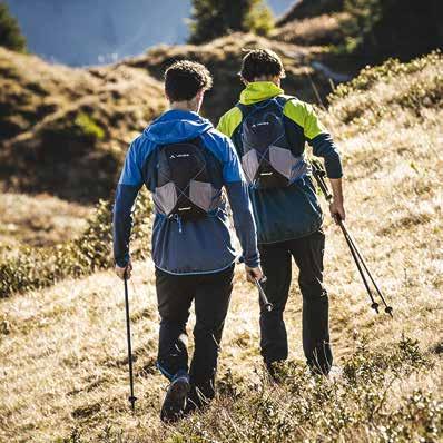 For the first time, an innovative 3D-knit construction has been used for the back. A globally unparalleled manufacturing process was developed in cooperation with the textile university of Albstadt-Sigmaringen that offers a compact fit for outdoor activities such as hiking, mountain biking or trail running. The new suspension system, Vent-Tex Spacerknit, is seamlessly knit from three yarns with individualized rigidity zones. The 3D-knit construction continues throughout the shoulders into the straps and allows the pack to be “worn” like a vest. The elastic 3D-knit construction creates continuous ventilation with better air circulation than any other body-contact suspension system. In addition to the 8-liter main compartment, the straps also feature various storage and slide-in compartments that provide space for gels, a protein bar, phone, MP3 player or water bottle. 475 g total.