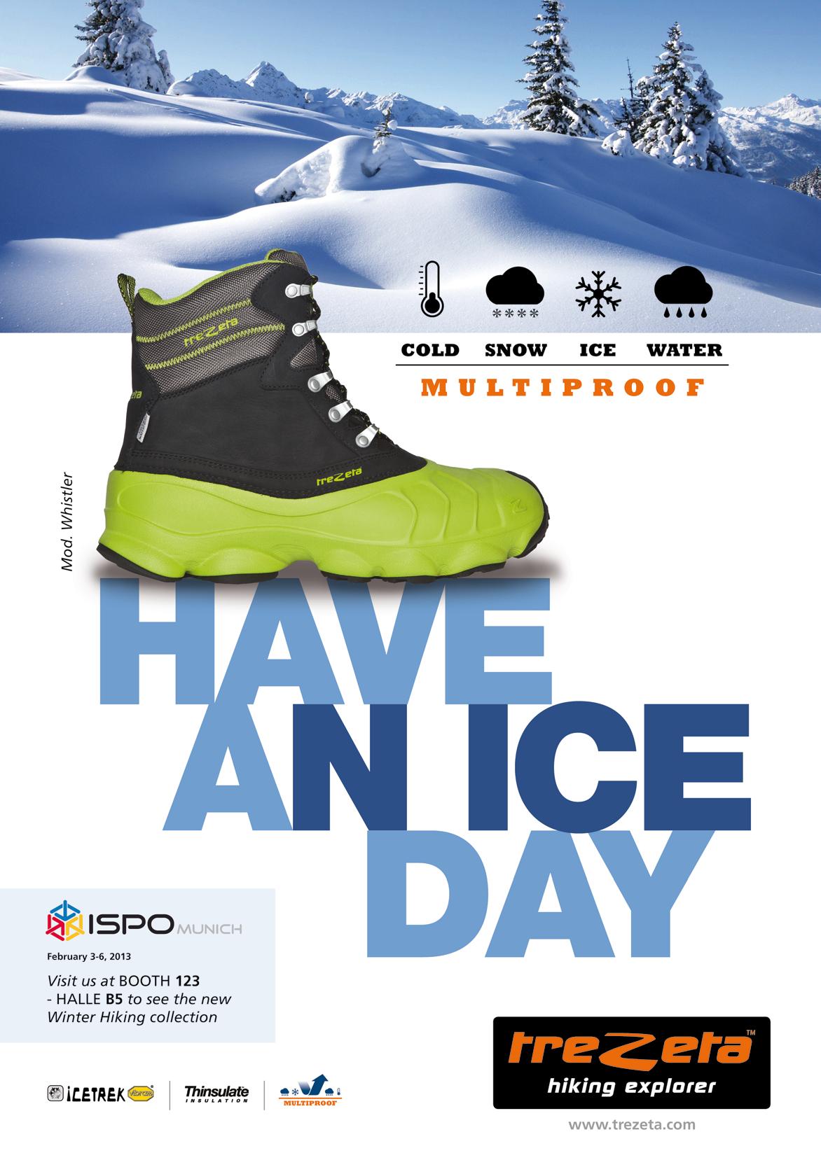This shoe was especially designed for leisure and outdoor activities during winter. Main features: full grain and suede 2 mm upper; Gore-Tex Performance Comfort and full grain leather lining; Vibram Cloud Ice Treck outsole; Ims^3 midsole with polyurethane exoskeleton bound to an Eva layer; nylon 1.5 mm and die cut Eva lasting board; footbed developed by PrimaLoft.