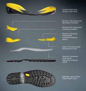 • exoSkeleton - È una nuova architettura che sostiene la tomaia, per garantire protezione e stabilità dove serve senza compromettere leggerez za e traspirazione. Si tratta di uno scheletro esterno costruito in poliuretano, che può essere applicato per sovrainiezione diret ta (Dip – Direct Injected Tpu) o spruzzato tramite uno speciale procedimento tecnico brevettato (Rpw – Sprayed Rubber Pu).