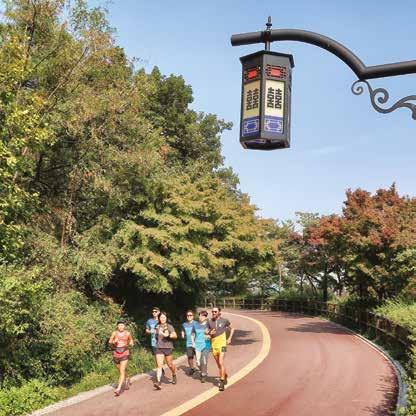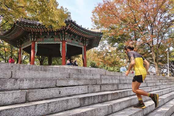 Corriamo sulla pista pedo-ciclabile che abbraccia tre quarti della collina alla sua base: una via larga con la mezzeria ben segnalata per dare un senso alle attività. Un nastro che sale e scende perdendosi nei magici colori dell’autunno, con un’illuminazione pubblica molto tradizionale (lampioni a forma di lanterna) e cartelli informativi di ogni tipo. Si corre e si chiacchiera in inglese, poi a piccoli intervalli c’è chi parla anche in coreano, mentre io e Michele ovviamente in italiano. Q uasi alla fine del percorso, usciamo dal tracciato attraverso una delle tante scale che collegano la città, leggermente sottostante al nastro asfaltato adibito a struttura sportiva, per poi infilarci in un single track che salendo si perde nella vegetazione. Il sentiero è tutto incredibilmente ricoperto da una sorta di stuoia spessa, un intreccio di corde color senape chiaro che lo percorre in ogni sua curva e asperità. Un lunghissimo tappeto che nelle salitelle più irte ha anche una serie di rilievi trasversali, sempre di cordura, ad agevolare la presa del piede in caso di pioggia. Questo tracciato, come già la pedonale prima, passa di fianco a diverse palestre da esterno, dove strutture per la ginnastica a corpo libero sono a disposizione dell’utenza. Gli utenti, in un giorno lavorativo come questo, sono in prevalenza pensionati (tanti) che amano stare in forma.