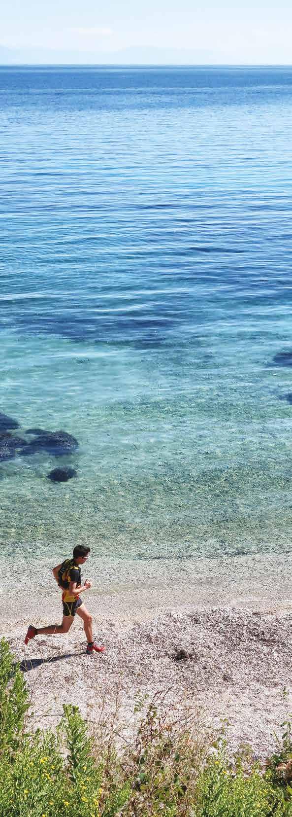 S ulla sinistra s’intravede il color smeraldo del mare nascosto dietro a una vegetazione mista. Marco opta per scendere da una scalinata affogata in un canneto, continuando a correre in riva al mare, mentre io dall’alto della strada tengo il suo ritmo e lo immortalo nel suo gesto tecnico (ora appesantito dalla battigia ghiaiosa). Finalmente troviamo la