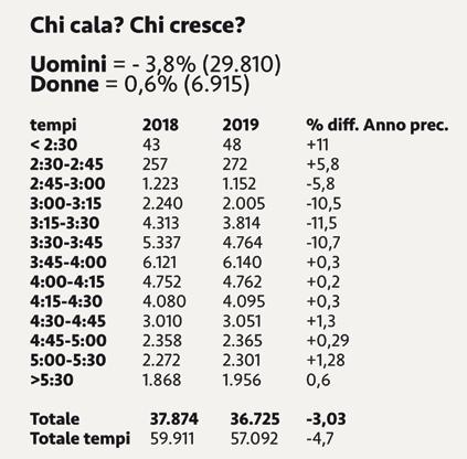 Ragione e sentimento, insomma. Se partiamo dalla prima, anche su questo numero trovate molti dati interessanti. Come quelli inerenti al calo dei maratoneti italiani (36mila runner nel 2919, ossia -3% rispetto al 2018). Un trend riscontrabile peraltro anche in un mercato ben più ricco e partecipato come quello statunitense (499mila finisher nel 2019 contro i 519mila del 2017, sempre nelle 42K). Non mancano, di contro, anche dati positivi. Come quello delle donne: +0,6% di maratonete italiane (a quota 6.871). Del resto la scena femminile nostrana si conferma in grande crescita: basti guardare il trend delle partecipanti ai principali eventi femminili della Penisola che vi presentiamo alle pagine 40-41. Ma è anche il dato generale a essere eclatante: secondo le ultime statistiche a livello mondiale relative al 2018 pare che le runner abbiano compiuto… uno storico sorpasso (50,24% rispetto agli uomini).