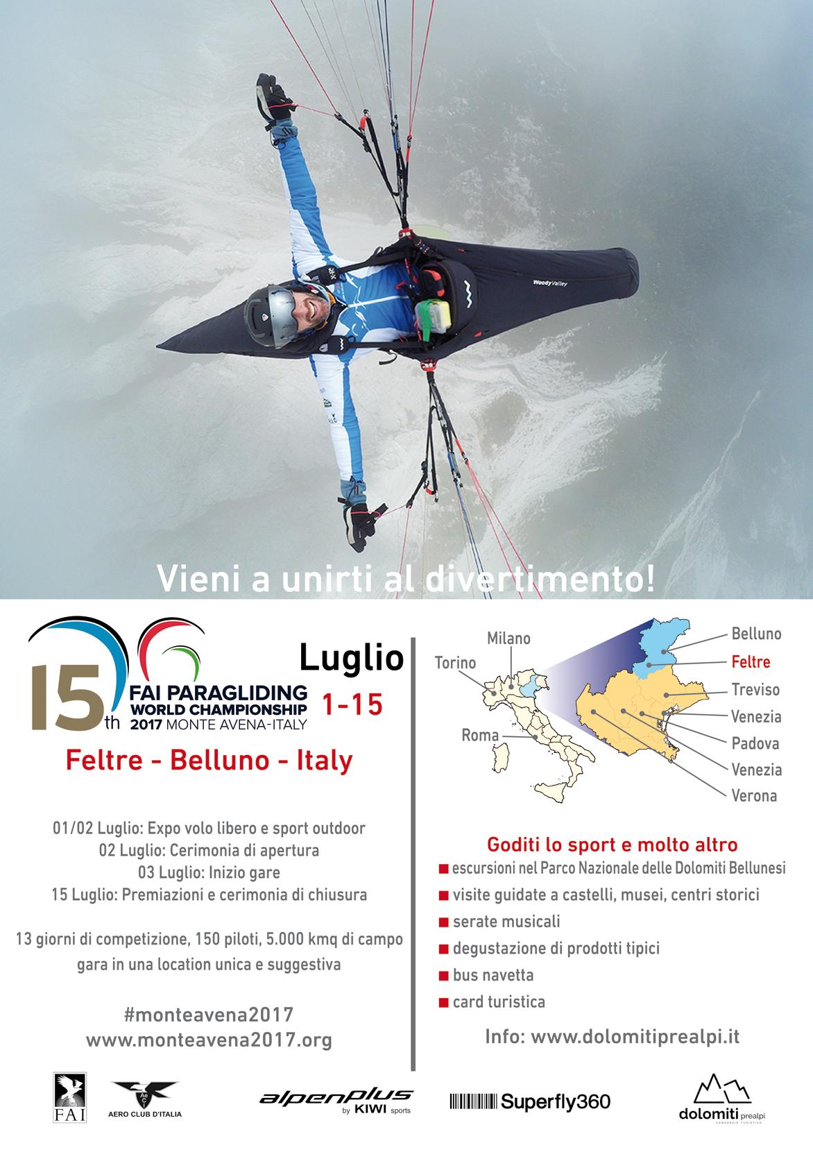 Le cime bellunesi faranno da cornice, dall’1 al 15 luglio, per i mondiali di parapendio. L’imperdibile appuntamento avrà il suo quartier generale alle pendici del Monte Avena e vedrà le vele di atleti provenienti da 35 nazioni solcare i cieli e rincorrersi in una superficie di gara di ben 5.000 kmq. 150 atleti stanno già lavorando sodo per conquistare un posto e contendersi il titolo di campione del mondo. Al fianco della competizione mondiale si è già all’opera per creare, durante i 15 giorni di manifestazione, eventi e iniziative a corollario per intrattenere accompagnatori e supporters. Saranno numerose e varie le opportunità per coloro che seguiranno il mondiale da terra: andare alla scoperta dei borghi storici della provincia di Belluno, prendere parte ad un’escursione naturalistica o scoprire i prodotti di eccellenza gastronomca che il Parco delle Dolomiti Bellunesi ha da offrire. Non mancheranno attività e gruppi di lavoro anche per i più piccoli. www.monteavena2017.org
