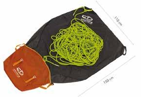 Sacco porta-corda con tracolla e telo integrato, pratico e facile da trasportare alla base della falesia, con dimensioni adatte al trasporto di una corda da 80 m e materiale d’arrampicata. È dotato di tracolla regolabile, con protezione per la spalla, per un trasporto più confortevole negli spostamenti e due maniglie per quello a mano. Dispone di un ampio telo integrato proteggi corda, misura 110 x 150 cm, completo di due asole per fissare l’estremità della corda. La corda può essere riposta in modo semplice e veloce all’interno della sacca, con una semplice manovra utilizzando le due asole del telo e la maniglia presente sulla sacca. Apertura e chiusura con comode fibbie regolabili in alluminio. Peso 380 g.