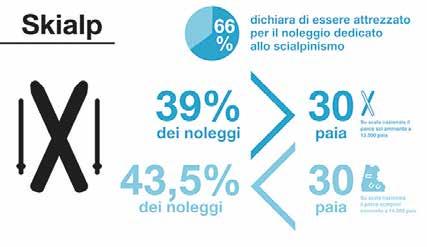 L’indagine ha inoltre rilevato che il 61,8% dei soggetti intervistati non rinnoverà il parco dei prodotti a noleggio per il periodo 21/22 Ma non per tutti la stagione è stata buia: infatti i dati riportano che il 66% dei noleggi possiede attrezzature dedicate allo scialpinismo, estremamente richieste quest'anno; benché ci sia stata difficoltà nel reperire il materiale nel corso della stagione, quasi il 40% dei noleggi ha una dotazione superiore alle 30 paia di sci da alpinismo e il 43,5% un parco scarponi che conta più di 30 paia.