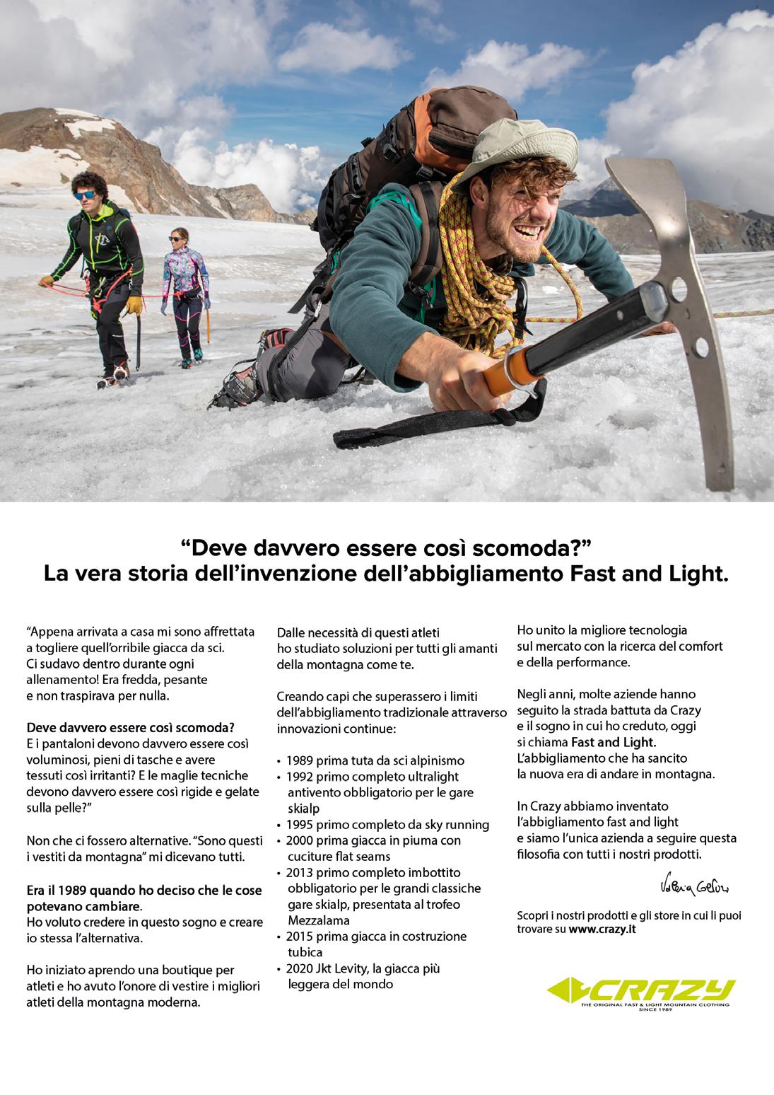 “Crazy è un’azienda nata immersa nel mondo race, Martina è una nostra ambassador per lo sci alpinismo fin dalla prima ora, credo che collaboriamo da almeno 10 anni e abbiamo condiviso con lei molte vittorie e podi importanti. La differenza tra atleti come Martina e “gli altri” è proprio la condivisone di uno spirito race “selvaggio”. Le gare di scialpinismo vere sono in ambiente, non su percorsi addomesticati. Con questo record Martina ha dimostrato carattere, resistenza, resilienza e la gioia di fare qualcosa di grande. Anche nell’approccio Martina ha dimostrato trasparenza e coraggio, dichiarare prima il proprio obiettivo non è cosa da tutti, questa onestà è uno dei motivi per cui la apprezziamo tanto”.