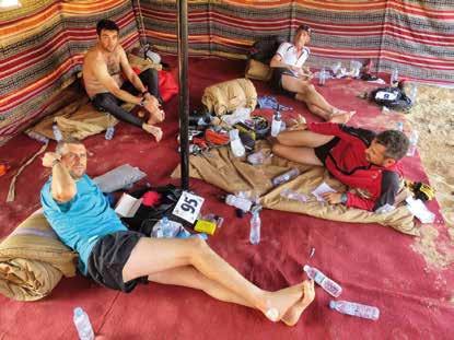 tra le 9 e le 11 per i primi e ben oltre per tutti gli altri, comunque sempre in pieno giorno, quando il sole è un disco infuocato che alimenta un caldo a dir poco torrido. Bere è d’obbligo: bere tanto, bere sempre. I ristori sono miraggi che diventati realtà e alleviano parzialmente una sete crescente e una calura cutanea che necessita micro docce di rinfresco. Una tappa invece, la più lunga (42 km), ha partenza pomeridiana e si allunga nei colori del tramonto per terminare nel nero della notte. In tenda