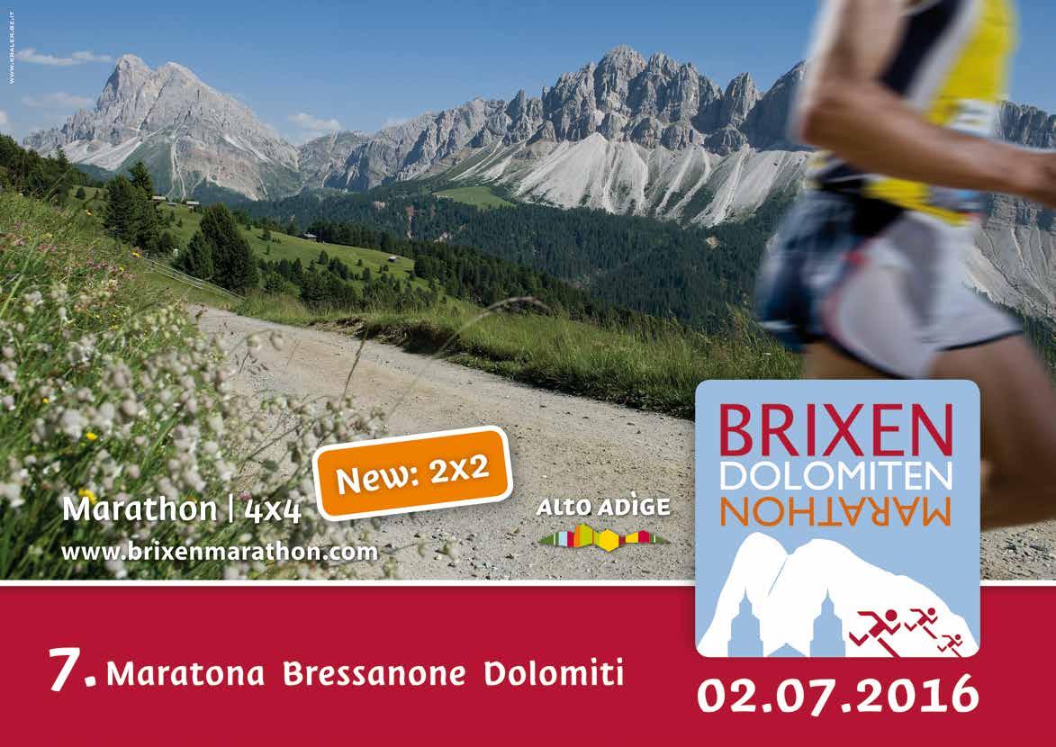 m, il programma prevede anche la competizione a staffetta 4x4 e per la prima volta 2x2. Kids Run Women’s run non competitiva nella giornata di venerdì daranno il via a questo intenso weekend di sport e passione. A tutti i finisher sarà data la speciale medaglia ideata dall’artista internazionale Peter Senoner. www.brixenmarathon.com
