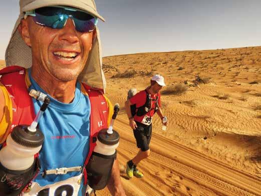 vano sul loro crinale. Ero solo e pensavo a tutti noi “soli” sparpagliati per il deserto, ognuno a fare i conti con le proprie forze e con le immancabili fatiche. Pensavo all’amica Cinzia, anche lei sola da qualche parte in questa morbida vastità arenosa. A un certo punto ero in salita e stavo camminando. Di colpo, da dietro, sento una voce armoniosa che canta “You’ll never walk alone”. Mi giro e vedo Finn che intonando l’inno a lui caro mi raggiunge, sottolineando con un sorriso che non bisognerebbe mai correre e camminare da soli. Mi affianca e mi accompagna per un lungo tratto. Scambiamo poche parole per non sprecare le energie residue non ancora evaporate al sole. Io scatto anche un selfie che ci ritrae entrambi stanchi ma sorridenti, poi lui allunga ulteriormente la falcata scomparendo dalla mia vista. Ma ogni tanto è molto bello restare soli, nel silenzio assoluto che ci circonda, sen-