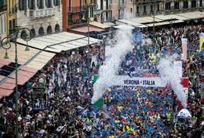 possono farlo”. Chiara Moras, grazie ai 39,2 km corsi, ha conquistato invece il gradino più alto del podio nella categoria femminile. Schierati sulla linea di partenza in Piazza Bra all’ombra dell’Arena c’erano anche i testimonial Giovanni Storti Claudia Gerini, Fiammetta Cicogna e il rapper Ghemon. Presenti anche numerosi atleti fra cui Alessia Trost, Marco Aurelio Fontana, Alessandro Pittin, Airton Cozzolino e Aaron Durogati, che hanno dato il massimo per questa esperienza all’insegna del divertimento, dello sport e della solidarietà. Un’edizione senz’altro di grande impatto e ben organizzata, anche se una piccola pecca è stata rappresentata dal servizio trasporti: molti runner terminata la propria corsa hanno dovuto attendere diverso tempo prima che un pullman li riportasse al village. L’appuntamento 2016 è per domenica 8 maggio.