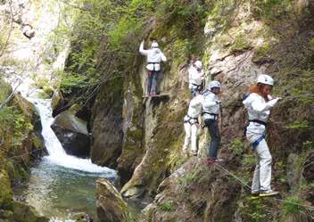 sion” nella natura che qui domina ovunque incontrastata. Da queste parti ogni stagione ha un suo segreto. In primavera, nel periodo dello scioglimento dei ghiacciai, rifiorisce la vita, i prati si riempiono di fiori e i fiumi iniziano a ingrossarsi. Ecco il momento giusto per fare tarzaning, in compagnia del “magic team” del Rafting Center Val di Sole, composto da veri esperti del fiume e degli sport di montagna, a partire dal direttore Alessandro Fantelli che ci accolti nel centro. L’attività di tarzaning viene svolta nelle gole e nei canyon, lungo un percorso che lascia senza fiato ma non richiede particolari doti fisiche. L’itinerario alterna passaggi su cavi di acciaio, ponti tibetani, discesa su carrucole, il tutto in completa sicurezza perché sempre assicurati attraverso imbrago e moschettoni