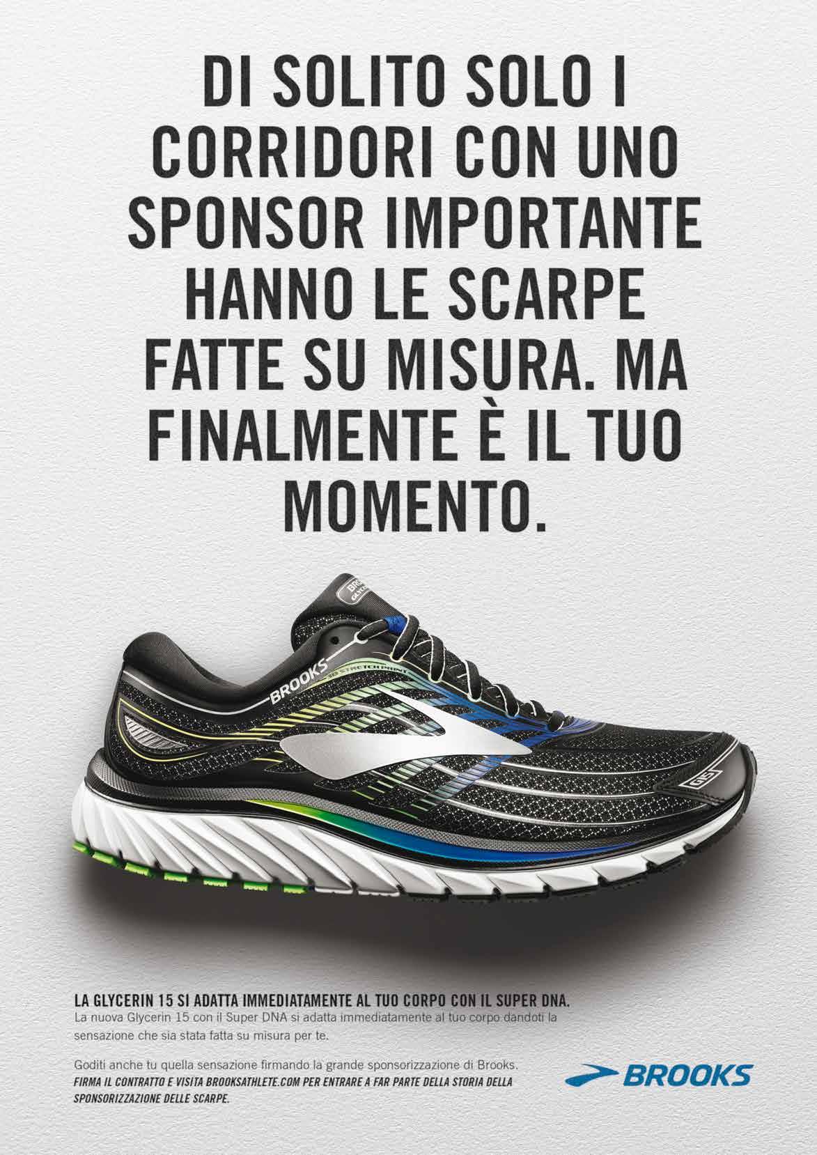 L’azienda di Seattle, celebre per la sua filosofia “Run Happy”, invita tutti i corridori del pianeta a diventare atleti sponsorizzati Brooks. Per farlo basta registrarsi su BrooksAthlete. com e avere così accesso a contenuti esclusivi preparati dagli esperti di Brooks su allenamenti, alimentazione e tanti altri argomenti legati al mondo della corsa. Brooks crede che tutti gli appassionati di corsa - siano essi ve-