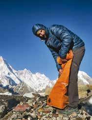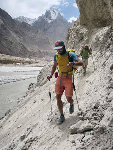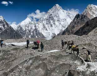 zuppe preparate dal cuoco della spedizione fanno il loro dovere riscaldando animi e corpi. Un paio di chilometri oltre Pajiu, il terzo campo, sito a quota 3.400 mt, ci si trova dinanzi al grande fronte del Baltoro, che con i suoi 60 km di lunghe e 700 km2 di superficie è uno dei ghiacciai vallivi più grandi al mondo. Completamente ricoperto da detriti rocciosi di ogni genere, forma e grandezza, questo gigante di ghiaccio è solcato da migliaia di crepacci, ruscelletti e fiumiciattoli che impediscono al camminamento una traiettoria retta, anzi lo obbligano a un percorso molto serpeggiante. Un sentiero per noi quasi inesistente e da ricercare tra le rocce, una mulattiera che però i muli e i cavalli da soma conoscono bene e che percorrono quotidianamente sotto i loro pesi. Il quarto campo, quello di Khubuosa (3.800 mt) è in faccia al magnifico massiccio delle Trango Tower, giusto dopo un guado in acqua logicamente gelida e decisamente torbida. La vita dei campi tendati è sempre la stessa, si montano le tende, si allungano i materassini, in qualche caso li si gonfia, si srotolano i sacchi a pelo, si aprono le borse e riposando si attende il calar del sole.
