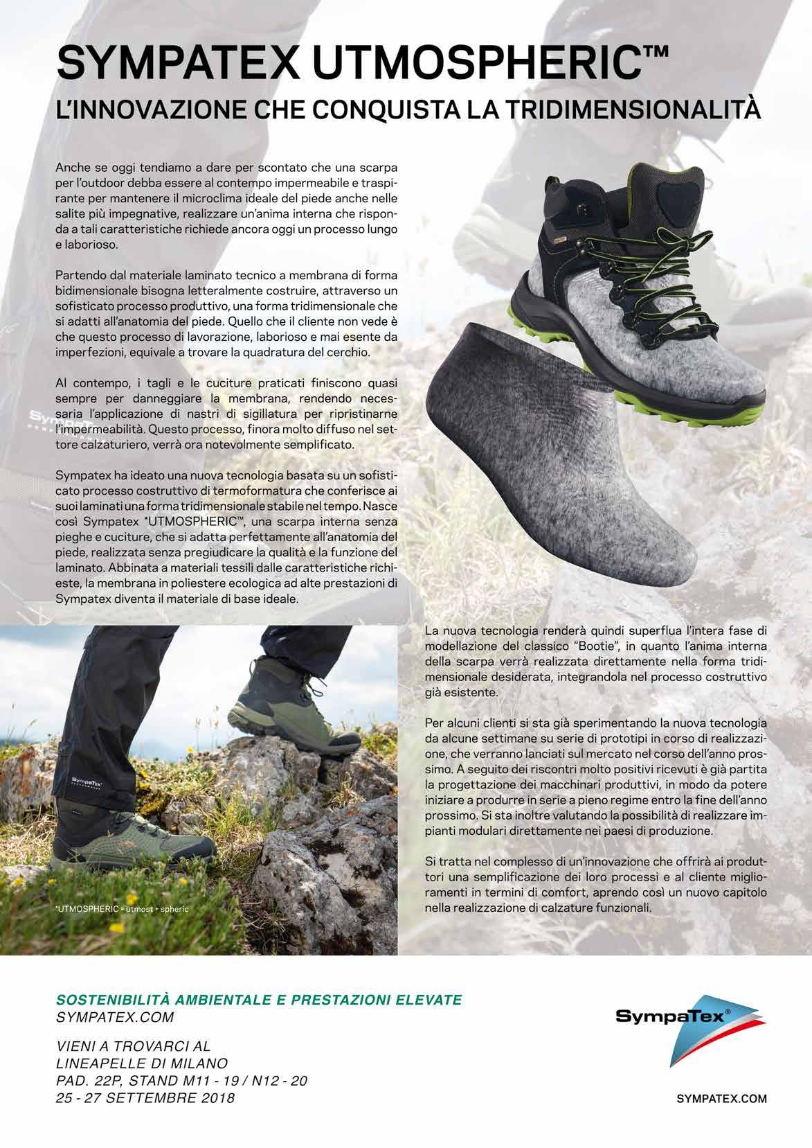 Si tratta di una nuova tecnologia, introdotta da Sympatex e finalizzata a rivoluzionare il mondo delle scarpe. Un sofisticato processo costruttivo di termoformatura che conferisce ai suoi laminati una forma tridimensionale stabile nel tempo. Parliamo di Sympatex Utmospheric e nello specifico si tratta di una calza interna che si adatta all’anatomia del piede. La stessa è realizzata senza pieghe né cuciture per non pregiudicare la qualità e la funzione del laminato. Presentata al pubblico in occasione di Lineapelle, salone che si tiene a Milano dal 25 al 27 settembre 2018, ovvia al problema di tagli e cuciture che, praticati normalmente nella realizzazione delle calzature senza processo di termoformazione, finiscono quasi sempre per danneggiare la membrana, rendendo necessaria l’applicazione di nastri di sigillatura per ripristinarne l’impermeabilità.