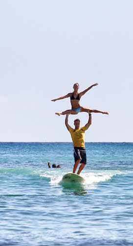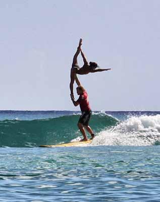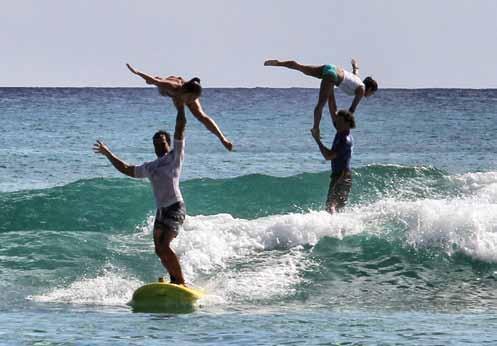 Vero. L’allenamento è molto vario, per metà del tempo siamo in acqua: in oceano per fare surf e in piscina per allenare il nuoto, l’acquaticità e la destrezza. Per l’altra metà si svolge su terra, principalmente in palestra, dove ognuno di noi deve lavorare con i propri esercizi, io di ginnastica artistica e acrobatica, Kalani per aumentare forza, resistenza ed equilibrio. E poi ci sono ovviamente gli allenamenti insieme, prima a terra per testare le pose e poi in acqua per accrescere il feeling e perfezionare la performance abbinata al surf. quante volte vi allenate insieme?