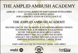 Amplid lancia un nuovo concetto di sponsorship: l’Amplid Ambush Academy. Si tratta di un progetto realizzato in collaborazione con GoPro e finalizzato a individuare 20 talentuosi snowboarder in cerca di un’opportunità di sponsorizzazione. Nel corso della stagione questi aspiranti pro-rider si sfideranno a colpi di foto e video. All’inizio di ogni mese della stagione invernale alle porte un membro dell’International Cartel Team di Amplid decide la sfida da sottoporre ai 20 candidati per un totale di 5 sfide. Il vincitore di ognuna riceverà dei premi. Inoltre a quelli che avranno maggiormente colpito l’azienda