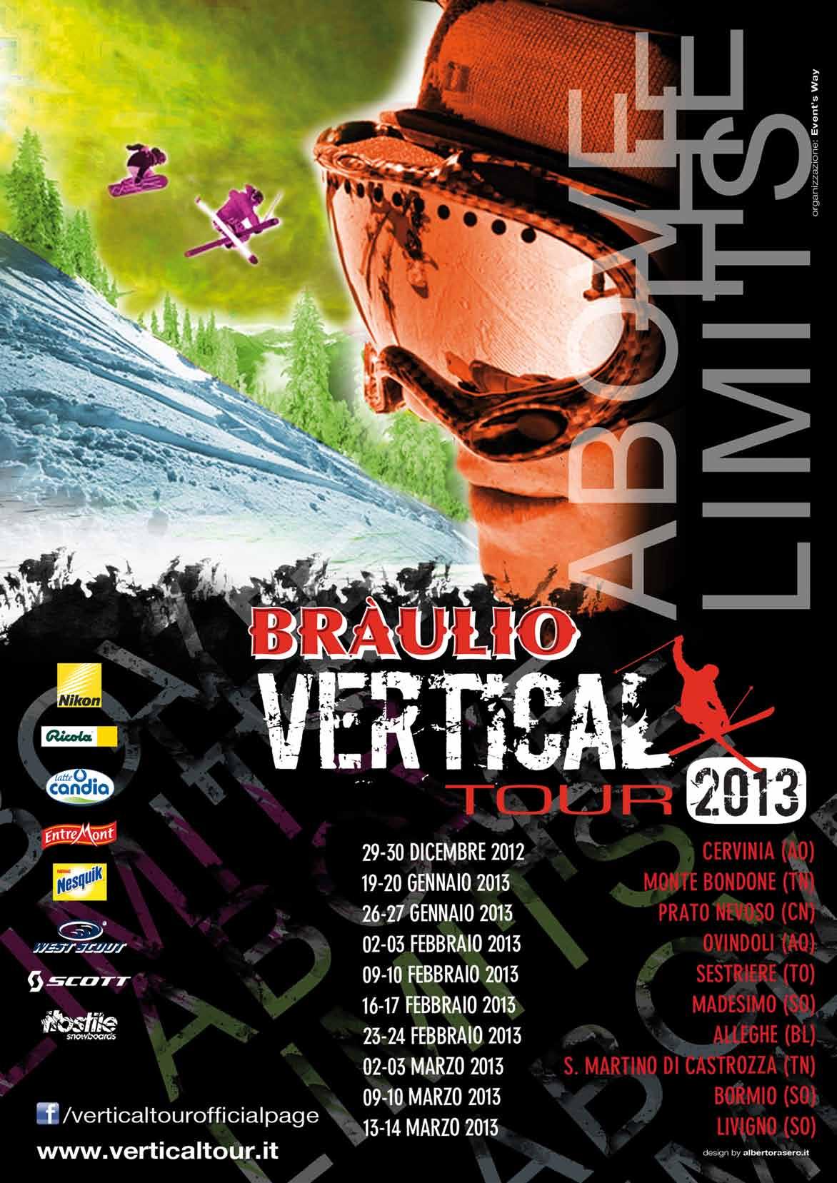 Lo staff del Bràulio Vertical Tour ha presentato l’edizione 2013 del circuito in occasione di Nissan Skipass, in scena alla Fiera di Modena dal 1° al 4 novembre. La sesta stagione del circuito, che ha confermato l’Amaro Bràulio come main e title sponsor, partirà il 29/30 dicembre a Cervinia per poi chiudersi dopo 10 tappe a Livigno il 13/14 marzo, evento TTR World Snow Tour 3 Stelle. L’evento, organizzato dall’agenzia torinese Event’s Way, negli anni ha catalizzato oltre un milione di spettatori e più di 500mila utenti unici sul sito. La formula resta quella classica: sono previste tappe di gara del Braulio Freestyle Contest, con montepremi dedicato, e tappe demo del Freestyle Show, nel quale tutti i rider potranno dare libero sfogo alla loro fantasia. Attesi atleti di alto livello, come già negli scorsi anni. La passata edizione ha incoronato nello snowboard Marco Donzelli, nel freestyle Valentino Mori. Ogni giorno nel parterre del Villaggio ci saranno prove tecniche di materiale, animazioni, giochi, degustazioni e gadgets. E a chiudere spazio alle serate evento Braulio Vertical Night. www.verticaltour.it