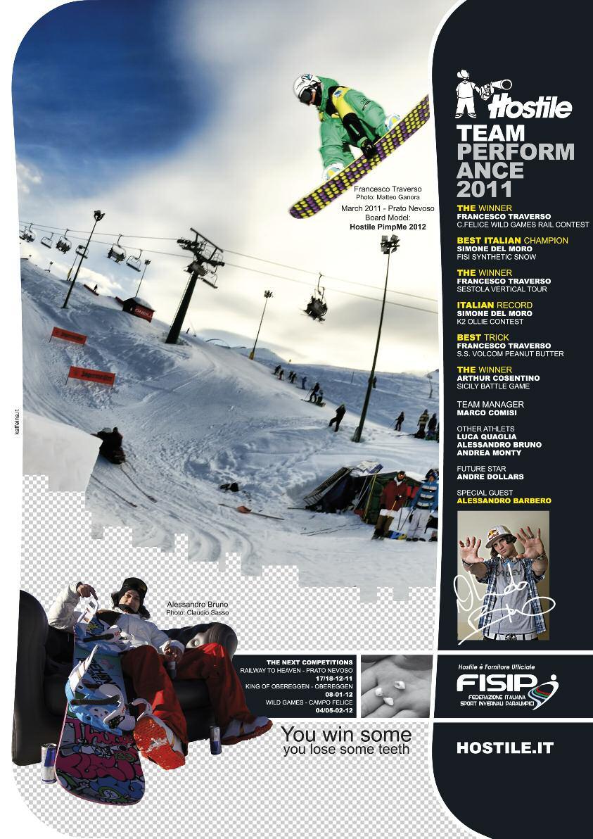 Sul fronte dei riders è pur vero che l’Italia è spesso considera ta di Serie B Ma non mancano alcune eccellenze conosciute e pure vincenti a livello internazionale Da Francisco Porc e l l a ( w i n d s u r f ) a d A l e x B a r b e r o ( b m x ) f i n o a d a r r i v a r e a l sorprendente Leonardo Fiora vanti (surf), al quale non a caso sarà dedica ta la cover stor y del prossimo numero Su quella odierna trova te invece il grande Alvaro Dal Farra, un altro fulgido esempio di persona ggio italiano conosciuto e rispetta to anche all’estero prima come rider e poi come opinion leader dell’fmx ma anche della scena action sport in generale Leggere l’articolo che gli abbiamo dedicato alle pagine 14-15 è sicuramente un altro bel modo di dimenticare per un po lo spread che sale e la neve che non scende