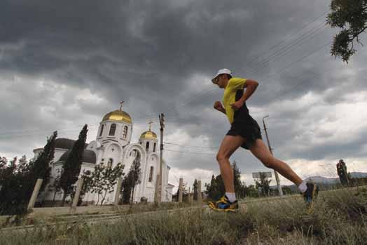 minato il granaio d’Europa. Una giornata nuvolosa in un’estate tanto calda può essere l’invito non previsto per correre senza levatacce mattutine e senza dover rinunciare al relax da spiaggia nel tardo pomeriggio. Il cielo grigio incupisce un panorama già carico di tinte opache, ma il quadro che ne deriva è comunque molto bello e le temperature finalmente umane. Chilometri e chilometri di un running senza una destinazione precisa, fra strade che affiancano le tipiche chiese ortodosse dalle cupole d’oro e fra a sentieri serpeggianti che salgono e scendono sui vari versanti montuosi. Il mare, normalmente azzurro e vivace, senza sole diventa nero, come lo vorrebbe il suo nome, ma resta ugualmente piatto e inaspettatamente molto trasparente. Io corro, fotografo e sudando mi godo il momento. Simone corre anche lui, ma fatica a tenere il mio ritmo e mi impreca per le distanze fuori dalla sua normalità. Tragitti sui 15-20 km di saliscendi continui. Percorsi rurali che ci restituiscono al caos cittadino completamente stremati e fradici ma visibilmente soddisfatti. Le vie di Koktebel sono ora un continuo brulicare di anime tormentate che senza una spiaggia soleggiata su cui sdraiarsi vagano in pena tra i vicoli del centro e le bancarelle della passeggiata pedonale. E dopo la sera comincia la movida, uno dei motivi turistici di grande richiamo, dove la birra e la vodka scorrono a fiumi, le luci dei locali brillano e lampeggiano senza risparmiarsi e la musica fa da colonna sonora alle tante notti brave.