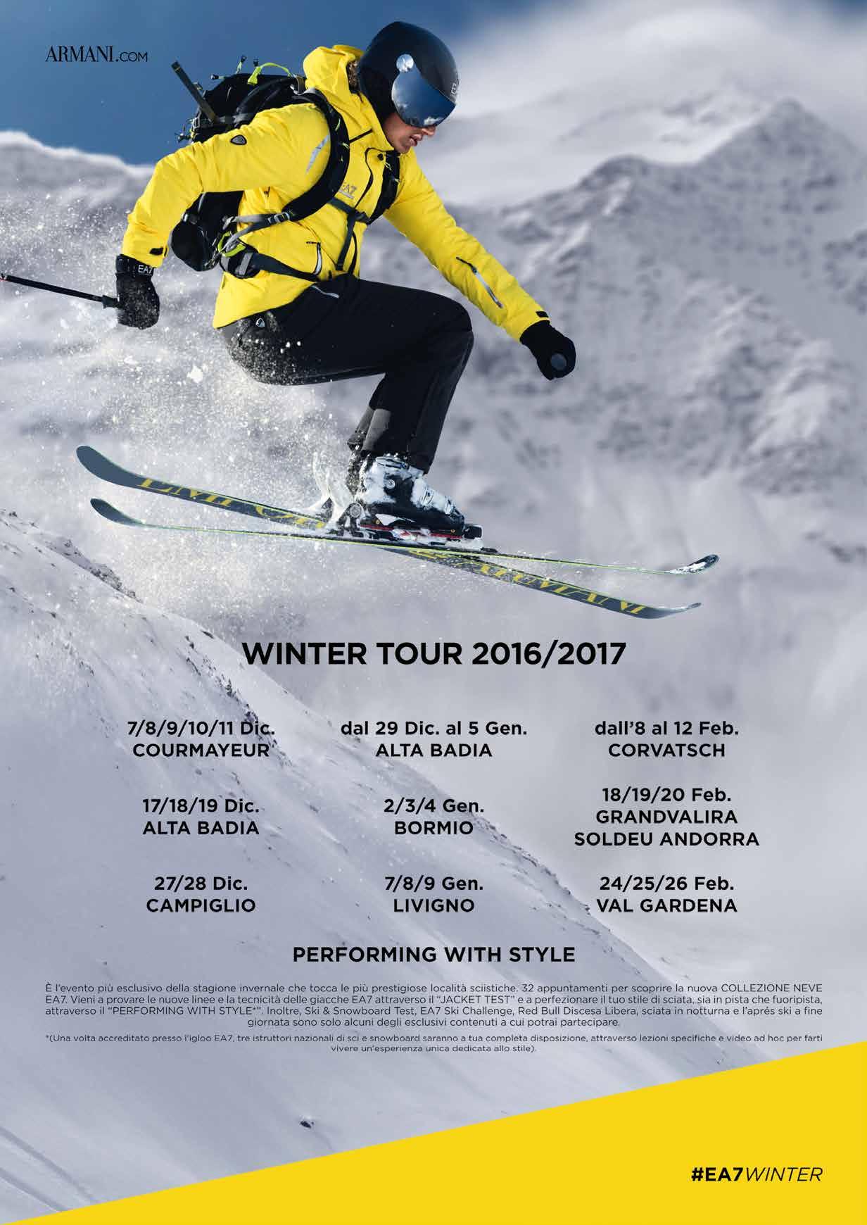 Uno dei road show più attesi della stagione sta per prendere il via dalle piste di Courmayeur. L’EA7 Winter Tour ha infatti scelto la straordinaria cornice del massiccio del Monte Bianco per dare inizio alla sua edizione 5.0 dal 7 all’11 dicembre. Anche per la stagione 2016/2017, centro di gravità delle numerose attività che caratterizzeranno ciascuna delle nove tappe in calendario evento, sarà l’inconfondibile igloo nero con il logo EA7. L’attività principale sarà come di consueto la possibilità di testare sulle piste gli outfit EA7 approfittando anche della compagnia di tre istruttori nazionali che potranno dare preziosi consigli su come migliorare il gesto atletico. Le attività di contorno comprenderanno anche per questa stagione il Performing With Style, l’EA7 Ski Challenge, la Red Bull Discesa Libera, gli Ski & Snowboard EA7 limited edition Test, lo Slalom Gigante EA7 e le discese in notturna.