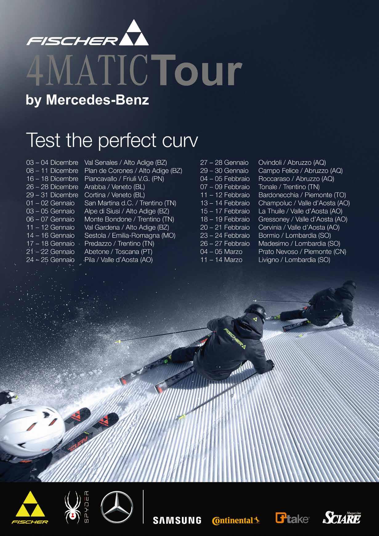 Al via il 3 dicembre in Val Senales il tour itinerante che vede i due brand leader nel mondo dello sci e nel mercato dell’automobile animare 26 appuntamenti nelle migliori destinazioni alpine e sugli Appennini. Il Fischer 4matic Tour by Mercedes-Benz rappresenta una straordinaria occasione per provare in prima persona come le due aziende abbiano trasportato il proprio know-how nel mondo dell’agonismo di vertice, in prodotti accessibili a un pubblico attento e preparato. Gli sciatori potranno “salire a bordo” dell’ultimo nato in casa Fischer, ovvero RC4 The Curv, lo sci che utilizza materiali innovativi e performanti, presi in prestito dalle gare di Coppa del Mondo, e rielaborati in un modello perfettamente sciabile in pista. Dedicati agli sciatori di alto livello, per curve perfette su piste dure, ben preparate e impegnative, gli sci della linea Fischer RC4 The Curv utilizzano materiali innovativi e performanti. Spyder, prestigioso brand statunitense di abbigliamento per lo sci, supporterà e arricchirà con la sua presenza il Tour. Altri partner dell’iniziativa saranno Samsung, Continental, Ttake e Sciare Magazine. Tra le prime date, dopo la Val Senales: 08 - 11 dicembre Plan de Corones / Alto Adige (BZ), 16 - 18 dicembre Piancavallo / Friuli V.G. (PN), 26 - 28 dicembre Arabba / Veneto (BL), 29 - 31 dicembre Cortina / Veneto (BL). Il Tour continuerà in diverse location anche nei mesi di gennaio e febbraio.