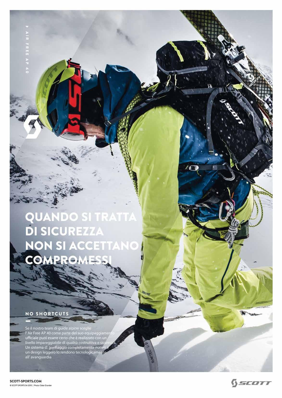 Ideale per i fuoripista, Air Free AP 32 è lo zaino perfetto per soccorritori e assistenti alle piste da sci. Questo zaino da 32 litri è il compagno ideale per qualsiasi avven tura sulla neve. Quando si parla di sicurezza, non ci sono compromessi. Se gli ski patrol di Chamonix si fidano dell’Air Free AP 32, tanto da inserirlo nella loro attrezzatu ra ufficiale, è certo che sia stato realizzato con un alto livello di qualità e una sicurezza ineguagliabile. Loro, che trascorrono più tempo sulle montagne di qualsiasi altra persona, necessitano di una buona protezione. Hanno parlato. Li abbiamo ascoltati: un sistema di gonfiaggio completamente nuovo e un design tecnico e leggero fanno di questa la prossima generazione di zaini antivalanga. Vediamone le caratteristiche: costruzione in 420 d nylon plain water repellent 1.500 mm e 210 d nylon double water repellent 1.000 mm. Dimensioni: altezza: 55 cm, larghezza: 32 cm, profondità: 22 cm, volume: 32 L. Peso approssimativo: zaino 1.620 g, alpride system 800 g, cartucce 440 g per un totale di circa 2.860 g. Zaino compatibile con Scott Alpride airbag system, certificato TÜV, dotato di sistema diagonale di fissaggio degli sci e a-frame oltre al fissaggio rimovibile per lo snowboard. È dotato di una tasca separata per l’attrezzatura di sicurezza (pala, sonda ecc.) e una tasca superiore per maschera con chiusura a zip e rivestimento in pile. Fissaggio rimovibile per piccozza/bastone. Comoda cintura anatomica imbottita con anello con portattrezzi sulla parte destra e tasca sulla parte sinistra. Cintura con cosciale di sicurezza e all’interno etichetta sos con istruzioni di emergenza. Non manca poi il fissaggio rimovibile per casco e uno strap sullo sterno con fischietto di emergenza. Disponibile nelle varianti colore black e burnt orange, eclipse blue. Prezzo al pubblico consigliato 739.00 euro.