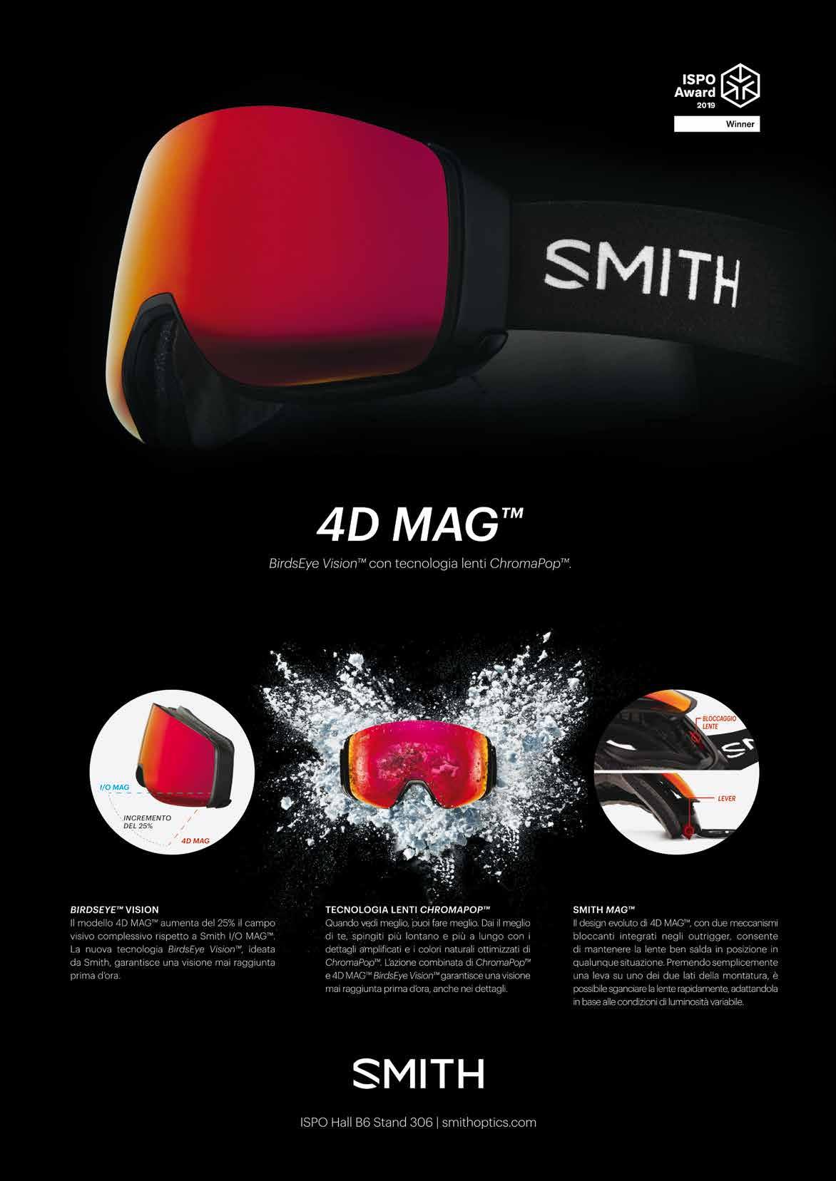 Smith si supera e per questa maschera introduce un’innovazione delle lenti che inalza gli standar. Parliamo del BirdsEye Vision, ovvero una tecnologia di ultima generazione, che aumenta del 25% il campo visivo complessivo delle lenti rispetto al modello IO/Mag del brand. Insieme è stato sviluppata anche la tecnologia Smith MAG, che integra il doppio meccanismo bloccante negli outrigger della montatura, per garantire un sistema di sostituzione delle lenti facile e rapido. La tecnologia BirdsEye Vision unita alle lenti ChromaPop consente di vedere ancora più dettagli. La 4D Mag è inoltre stata studiata per essere compatibile con il casco e presenta una tecnologia di integrazione AirEvac che riduce l’appannamento. L’elastico ultralargo siliconato si adatta a ogni tipo di testa e casco.