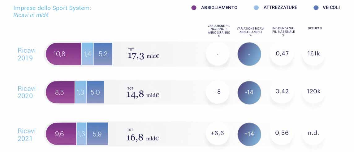 S econdo tali analisi lo Sport System contribuisce in modo significativo all’economia italiana, grazie al lavoro di 65.000 società sportive, 10.000 imprese produttrici, 9.000 società di gestione impianti e 50 tra società editoriali e di scommesse. Nel complesso impiega circa 400.000 addetti. In un anno medio di riferimento, le imprese produttive dello Sport System hanno una potenzialità di oltre 17 miliardi di fatturato annuo, il 62% attribuibile alle aziende di abbigliamento e calzature. Con un contributo al Pil nazionale dello 0,47%.