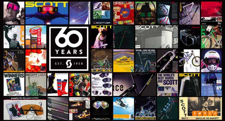 Per il suo sessantesimo anniversario, Scott ripercorre le tappe di un percorso fatto di impegno e passione sportiva. Lo sport è da sempre al centro della ricerca di Scott che, dal 1958 a oggi, non ha mai smesso di rinnovarsi nella tecnologia e nel design. Nel mondo bike, il marchio rappresenta oggi un punto di riferimento grazie a prodotti di altissima qualità. Le bici Scott si sono, inoltre, rese protagoniste dello sport professionistico, seguen-
