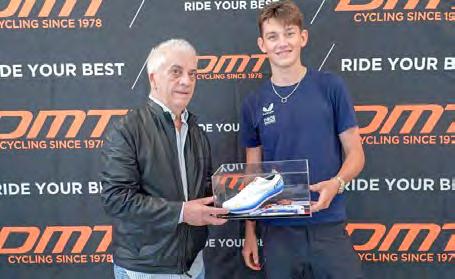 DMT, brand dell’azienda manifatturiera Diamant S.R.L., si riconferma un punto di riferimento per le calzature da ciclismo conquistando una sempre più ampia community di corridori, fino a campioni del calibro di Elia Viviani e Tadej Pogačar, per cui il marchio ha disegnato calzature su misura. A questa famiglia si è aggiunto il gallese Joshua Tarling, giovane promessa che, a soli 19 anni, vanta già un palmarès invidiabile come uno dei migliori cronoman al mondo. Anche Tarling – campione europeo contro il tempo a Drenthe, detentore del titolo nazionale britannico nella stessa categoria e bronzo al Mondiale di Glasgow – ha ricevuto la sua calzatura personalizzata: una scarpa con lacci bianca dalle sfumature blu con i dettagli delle stelle di campione europeo a cronometro.