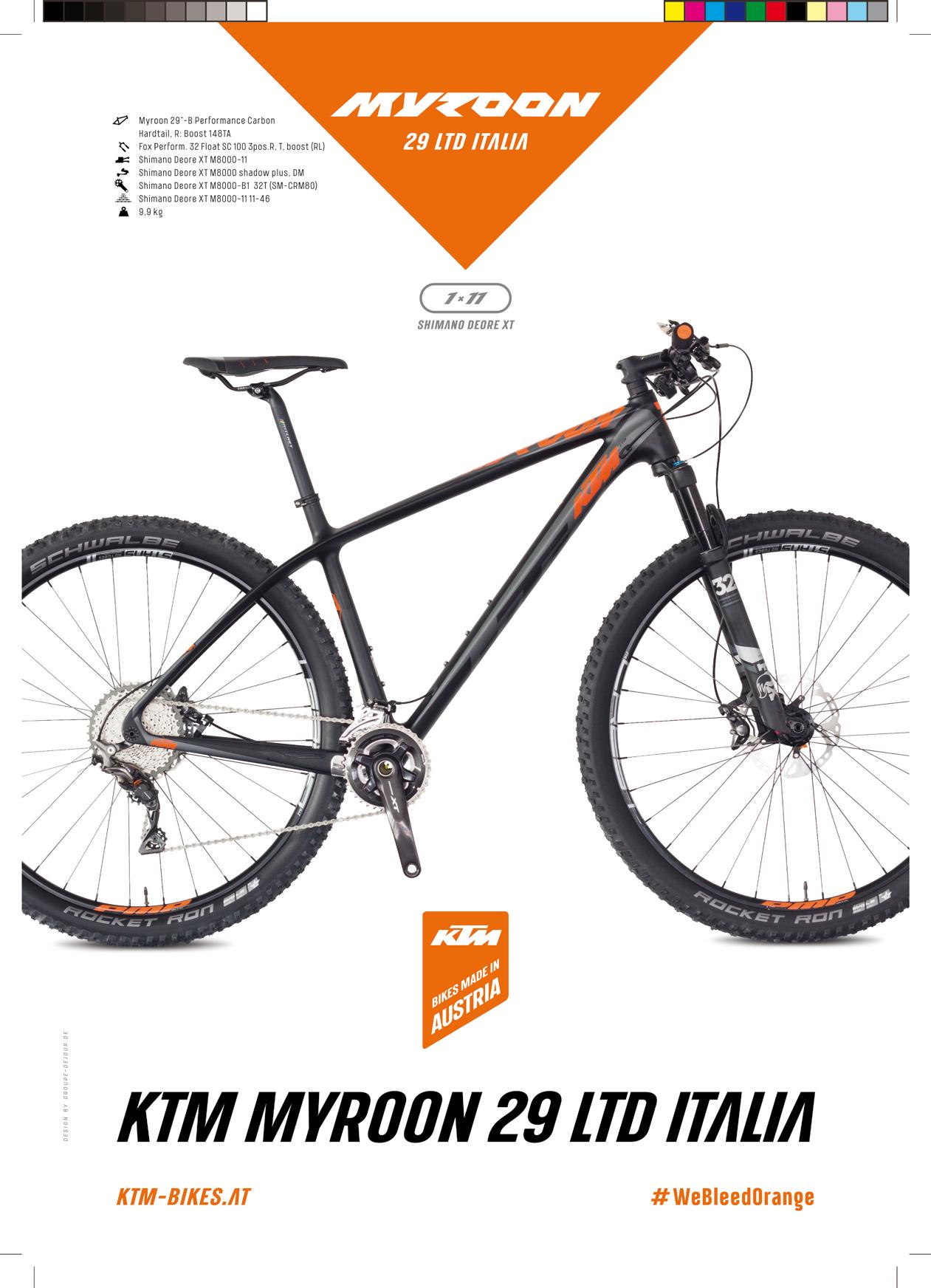 Sarà merito della vicinanza geografica con l’Austria, patria di KTM; sarà merito dell’attenzione del nostro mercato verso le mountainbike da cross country agonistico, sarà un insieme di fattori, ma anche per il 2017 KTM presenta questa bici in edizione limitata espressamente dedicata al mercato italiano (prevista la produzione di 300 unità). Si tratta come accennato di un performante mezzo da gara con una grafica e una componentistica “race oriented”, adatta a soddisfare le esigenze dell’agonista più attento e competente ma con un rapporto qualità prezzo veramente interessante Il gruppo è completamente Shimano XT, con cambio 2X11 (cassetta pignoni 11-46) e freni con dischi da 180 mm. Le ruote sono dell’italiana PMP con cerchi