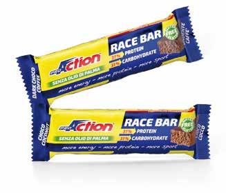 gli sport in cui la lunghezza è maggiore alle due ore e mezza. Ideale anche come spuntino nelle attività di fitness, Race Bar contiene ingredienti di alta qualità tra cui il 37% di proteine, su 100 g, derivate e isolate dal siero del latte e proteine della soia con cioccolato di alta qualità, al latte e fondente.