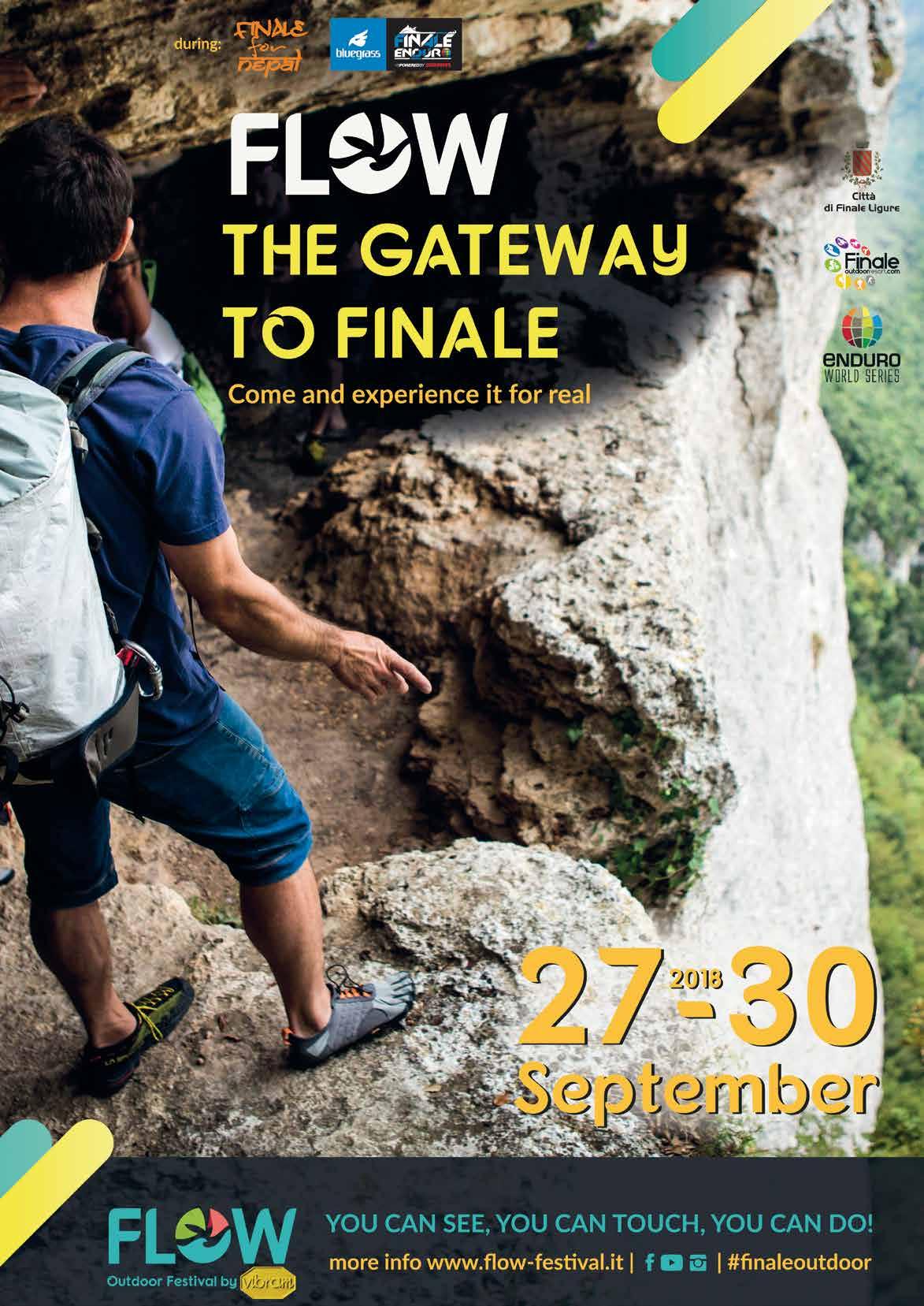 Si terrà a Finale Ligure, dal 27 al 30 settembre 2018,il Flow Outdoor Festival by Vibram: quattro giornate dedicate al mondo outdoor che coinvolgeranno atleti, appassionati e addetti ai lavori con attività, escursioni, contest e conferenze. Reduce da una prima edizione di successo, che ha registrato 25.000 visitatori e la partecipazione di oltre 1.100 atleti, il festival torna nel 2018 con Vibram come partner ufficiale, e in collaborazione con due grandi manifestazioni: Finale For Nepal, appuntamento imperdibile per gli amanti dell’arrampicata, e il Grand Finale Enduro World Series. Due prestigiosi eventi che porteranno a Finale Ligure migliori atleti