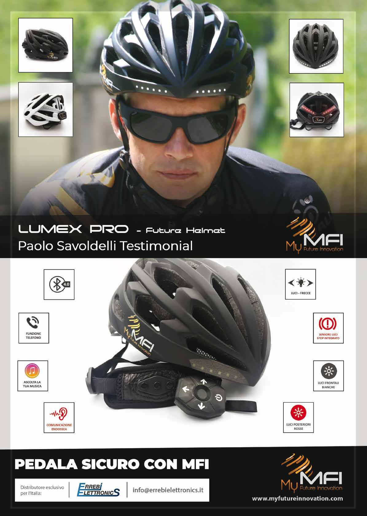 Always connected. Thanks to a series of gadgets that focus on security, this is the main purpose of the MFI features: always guarantee the possibility to travel and play sports, limiting the dangers. The new born, the Lumex Pro Carbon helmet is not far behind, in only 270 grams of weight. A racing aspect that maintains the fundamental characteristics of MFI. Safety is ensured by a complete fit adjustment system, with a rear rotor that allows a micrometric fit to the nape and a lacing system with incorporated the ability to act on the functionality of the helmet through a remote control. The cap meets stringent international standards for impact protection and is built to leave plenty of room for air intakes. The novelty is the presence of an accelerometer, which allows in the event of sudden braking to activate a rear indicator (red light). In this product there are also LED front lights with great illuminating power, to face any condition of use. Lumex is also equipped with a Bluetooth 4.0 connection with which to interface with your smartphone and listen to music with the diffusion technology through a “bone conduction”. The feeling is that of being enveloped by sound without eliminating environmental noise, ensuring maximum safety. Phone calls work the same way. You can make conversation clearly without taking your hands off the handlebars, thanks also to the remote control, to access all the features with just one finger.