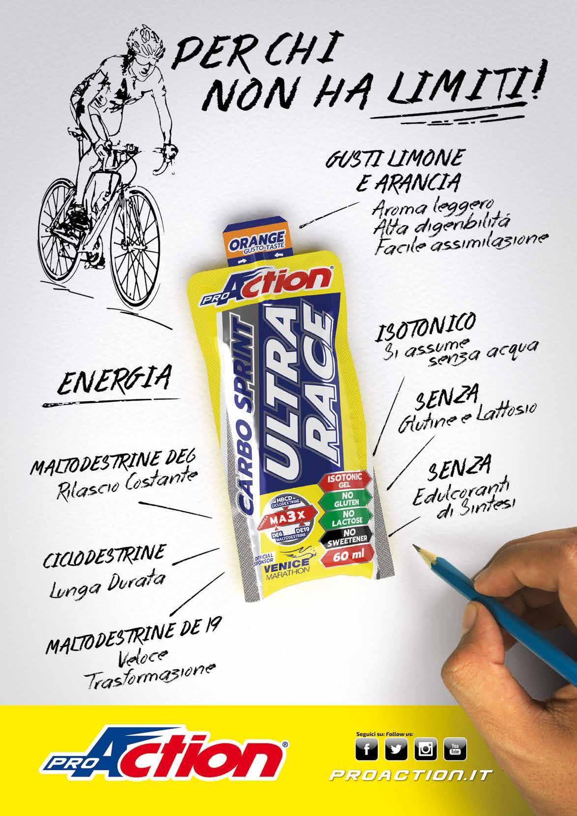 Dedicated to the “Pirate” Marco Pantani and to his most glorious year, when he won both the Giro d’Italia and the Tour de France, 46 years after Fausto Coppi. After Marco, nobody managed to repeat the exploit. To celebrate the 20th anniversary ProAction, in partnership with the Marco Pantani Foundation, has decided to launch a bar dedicated to this great hero. With a high energy content, the Hero bar contains isomaltulose, a long-life carbohydrate that is absorbed slowly and gradually avoiding glycemic peaks; magnesium combined with slowabsorbing sugars, to reduce fatigue and tiredness; and carnitine, which stimulates the use of lipids for immediate energy. Ideal for all endurance sports that require high energy consumption (granfondo, marathon), it is the perfect adventure companion during the toughest and longest races.
