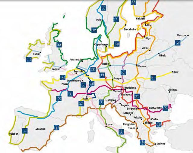 • Aumentare sostegno da parte del la Commissione Trasporti, degli Stati membri e delle regioni, alla rete di ciclo vie europee EuroVelo Cycling Network e alla sua integrazione con le reti fer roviarie