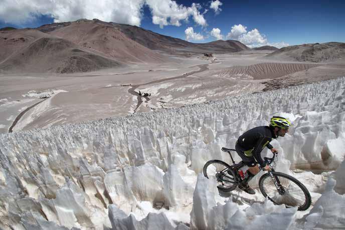Nei giorni precedenti al tentativo riuscito di record Nico, con il suo mini team tecnico che lo ha seguito anche negli allenamenti, ha rifinito la preparazione su un altipiano incastonato sulle Ande a nord del massiccio dell’Aconcagua. Una piana di svariati chilometri dove pedalare acclimatandosi tra i 4000 e i 5500 metri di quota, una distesa arida e bellissima circondata da vette innevate, ghiacciai e bellissimi penitentes, estese formazioni di alte lame nevose tipiche di questa zona. Un po’ per gioco e un po’ per sfida, Nico, tra i vari allenamenti si è immerso anche in questo labirinto di cristalli che
