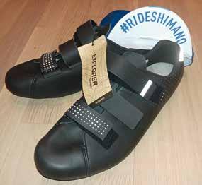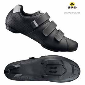 RT5 la versatilità sopra a tutto La scarpa RT5 di Shimano si fa di sicuro no tare. È uno dei due modelli della serie Ex plorer proposti per il cicloturismo, quindi la versatilità d’uso è fondamentale per questa tipologia di prodotto. La RT5 è adatta all’u so in città, durante gli spostamenti di tutti i giorni ed è perfetta anche in accoppiata con le eBike trekking, urban e da cicloturismo È ideale infatti anche per percorrere molti chilometri, grazia alla grande comodità della tomaia in cuoio sintetico. La chiusura regolabile e aderente è garantita da tre larghi strap. La possibilità di movimento è data dalla suola in gomma e dalla tacchetta SPD (invece che la classica da strada), ciò la rende adatta a districarsi nel traffico cittadino ma anche ai fondi dissestati o alle strade bianche con la propria eBike da trekking. Lo sgancio/aggancio risulta semplice e intuitivo. La rigida suola è in fibra di vetro per una trasmissione della potenza della pedalata paragonabile a quella di una scarpa da ciclismo tradizionale. Completano le dotazioni della Shimano RT5 degli inserti hight visibility a 360°, per muoversi anche in situazioni di scarsità di luce, come in giri serali o per rientrare dall’ufficio.