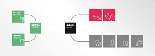 Il sistema si compone dell’unità Bloks Node che connette tutti i componenti della propulsione elettrica con l’unità Bloks Central. Quest’ultima, grazie al comando al manubrio Bloks Remote, elabora le informazioni poi visualizzabili sul Bloks Display