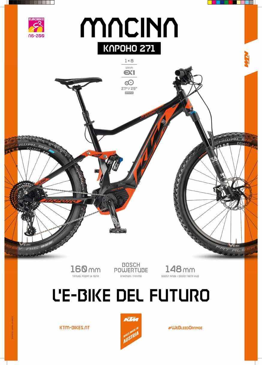batteria integrata sarà la KTM Macina Flite, definita come una sporty-eBike, un ibrido po’ urban, un po’ street e un po’ gravel, con ammortizzatore nel tubo ster zo, parafanghi e un estetica veramente accattivante, anche grazie ai cerchi Am brosio arancioni. La nuova gamma KTM eBikes sarà a Eurobike allo stand n° A6200.