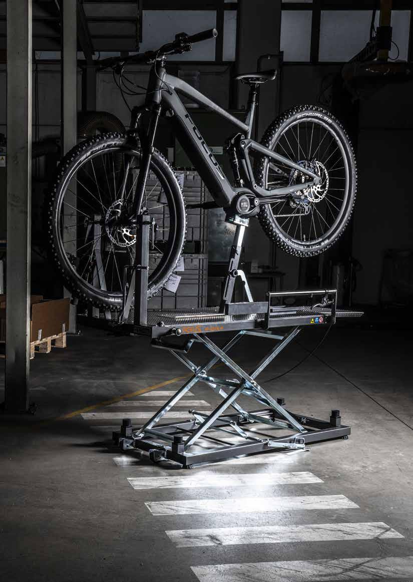 Il primo banco da lavoro pensato per le elettriche, grazia al suo sistema di carico allevia dall’onere di sollevare bici che pesano oltre 20 chili e permette un fissaggio stabile e sicuro delle stesse. Si accompagna la bici sulla pedana e con un gesto si inizia a lavorare in modo veloce e sicuro.