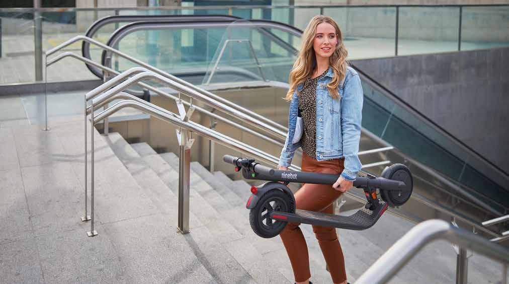 E22E di Segway-Ninebot è pensato per soddisfare tutti i bisogni di coloro che quotidianamente si muovono in città, pesa solo 13,5 kg e può essere trasportato ovunque grazie al sistema di chiusura rapida. Il design è elegante, la cura per i dettagli è evidente a primo impatto e i vari sistemi di sicurezza integrati permettono al prodotto di posizionarsi tra i migliori monopattini elettrici presenti sul mercato. Tra le novità più interessanti che rendono la guida del nuovo E22E an cora più fluida e confortevole ci sono le ruote da 9” completamente rin novate, dotate di schiuma interna a doppia densità Flat-Free che offrono comfort e assorbimento delle irregolarità del terreno pari a quelle pneu matiche, senza rischiare forature o manutenzioni aggiuntive. Inoltre il motore brushless a corrente continua, integrato nella ruota an teriore da 300 w, consente al modello di affrontare pendenze fino al 15% e raggiungere la velocità massima di 20 km/h.