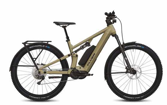 cerchi da 27,5 pollici per una migliore manovrabilità. La potente batteria da 750 Wh integrata (630 Wh di serie per la taglia S e per l'allestimento 2.10) può essere facilmente estratta lateralmente e ricaricata all’esterno. Per tour particolarmente lunghi è possibile montare il Range Extender da 540 Wh, disponibile come optional e applicabile in qualsiasi momento, che raddoppia l’autonomia della bici. Flyer offre una garanzia estendibile a quattro anni sulla parte elettrica, inclusa la batteria. Il nuovo sistema FIT 2.0 con connettività Bluetooth garantisce un’interfaccia ricco di funzionalità e informazioni sul modello. Goroc X è disponibili in tre allestimenti e due colorazioni: Sahara Sand Satin (in foto) e Black Shading Satin.